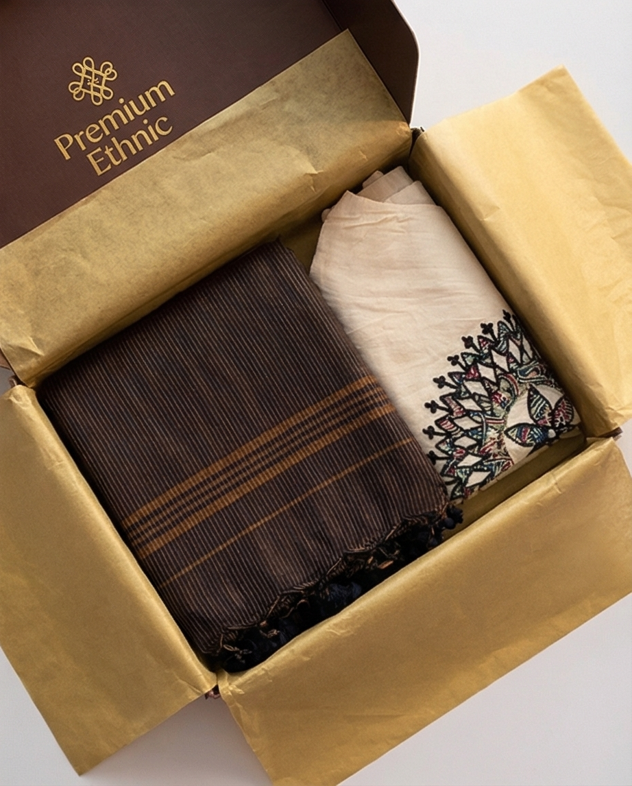 Khadi Cotton saree with all over zari lining with pallu in tassels