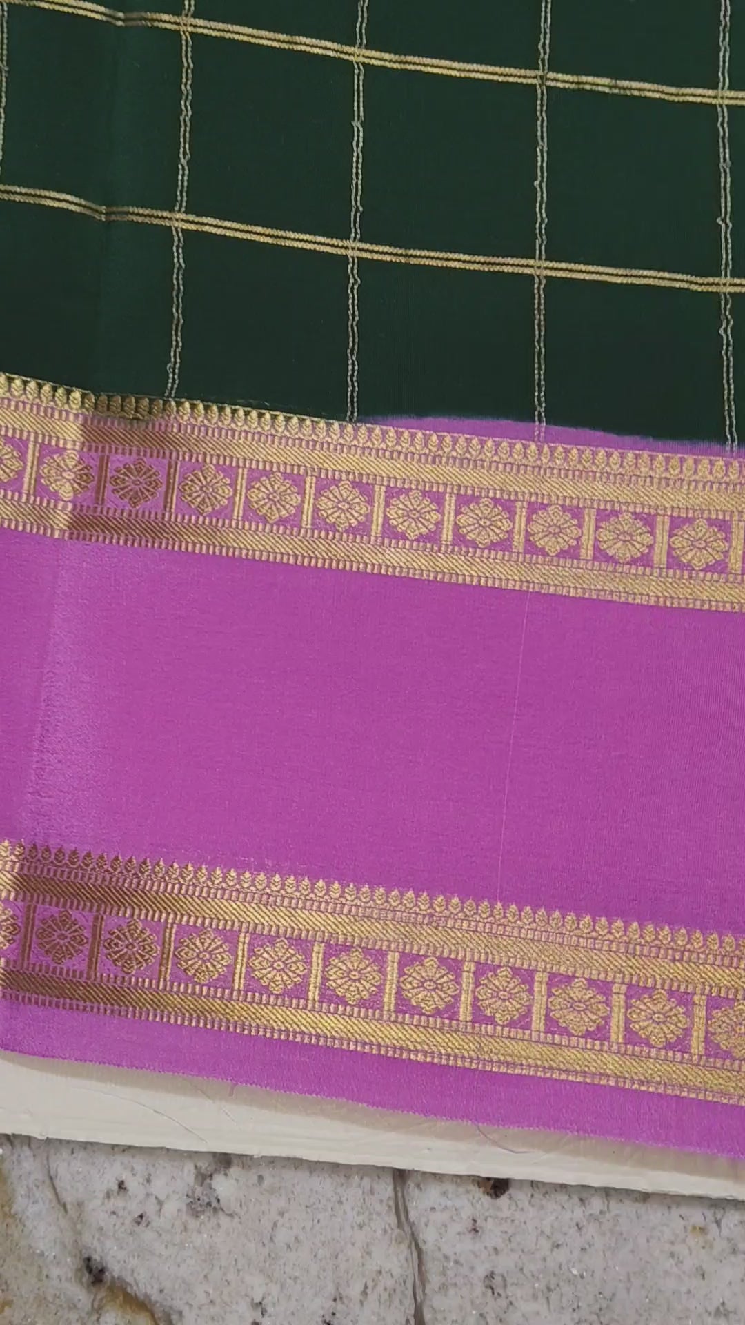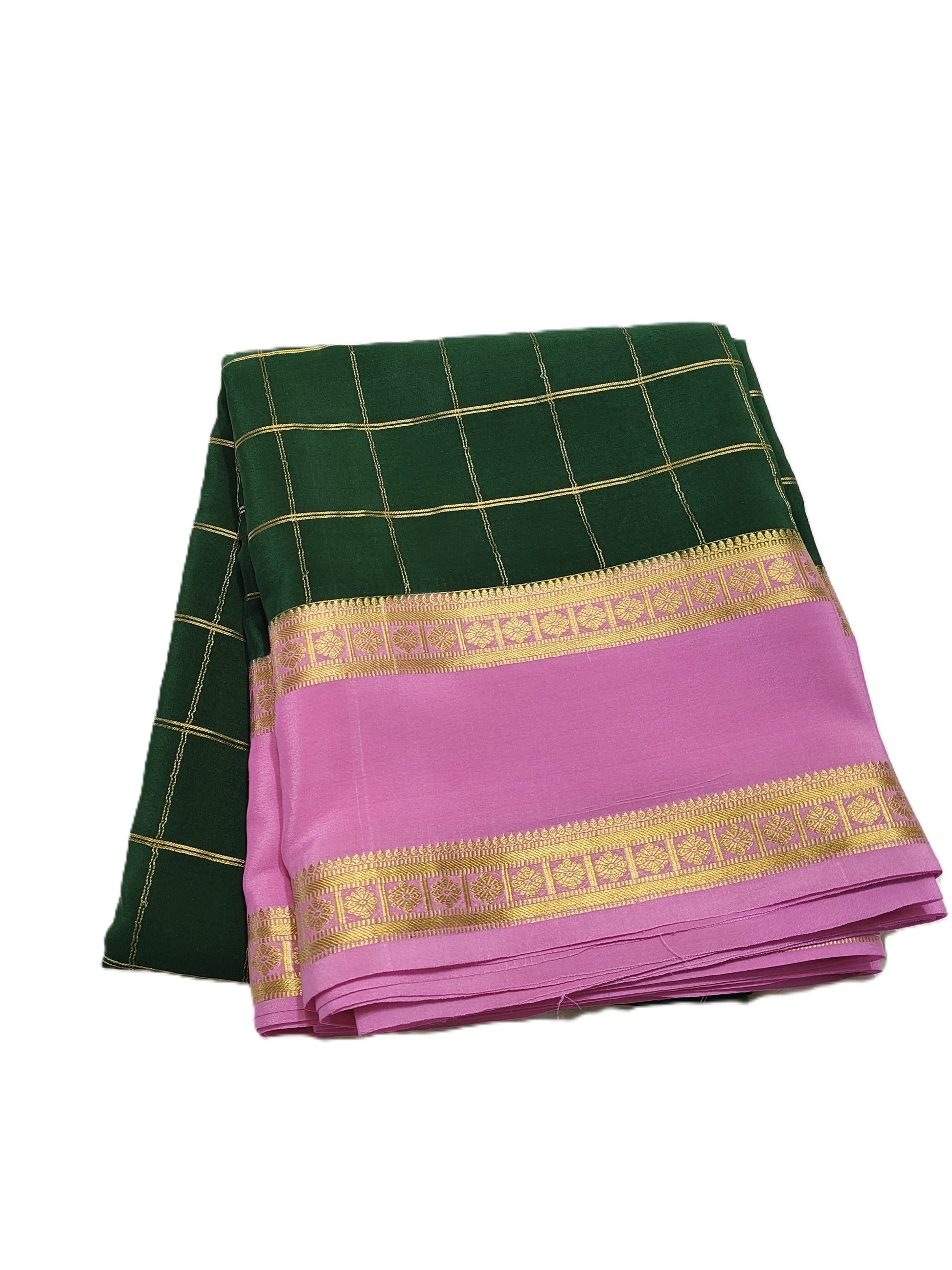 Pure Mysore Silk saree with golden checks, paired with a contrasting zari border. Crafted in premium 120 GSM silk for a smooth, elegant drape. Saree length: 6.3 meters including blouse. Blouse piece: 0.8 meters in matching border color.