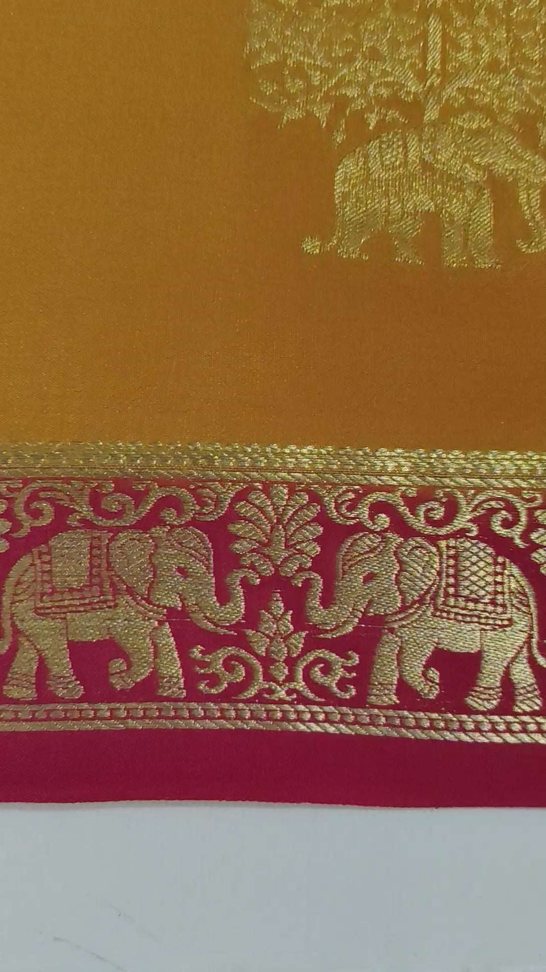 Pure Mysore Silk saree with intricate zari motifs, paired with a rich border featuring traditional elephant and floral designs. Crafted in premium 120 GSM silk for a smooth, elegant drape. Saree length: 6.3 meters including blouse. Blouse piece: 0.8 meters in matching border color.