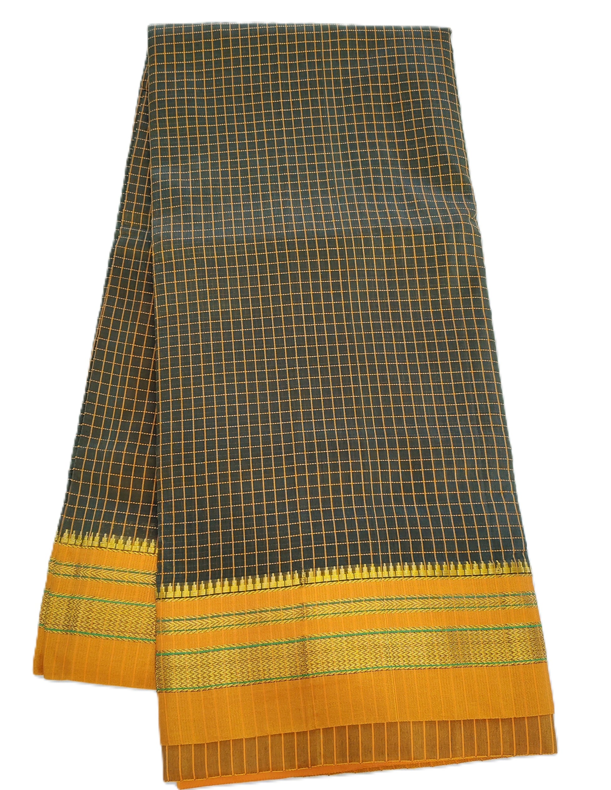 • Body Pattern: The saree features a classic small grid or check pattern (Kattum) created with fine yellow threads. This gives the dark fabric a textured, multi-dimensional look.