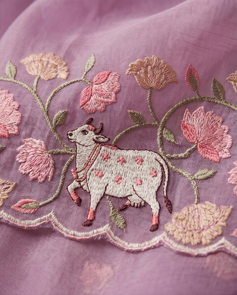 .Whimsical cow motifs — small, hand-embroidered cows in white with delicate detailing, a distinctive and charming design choice