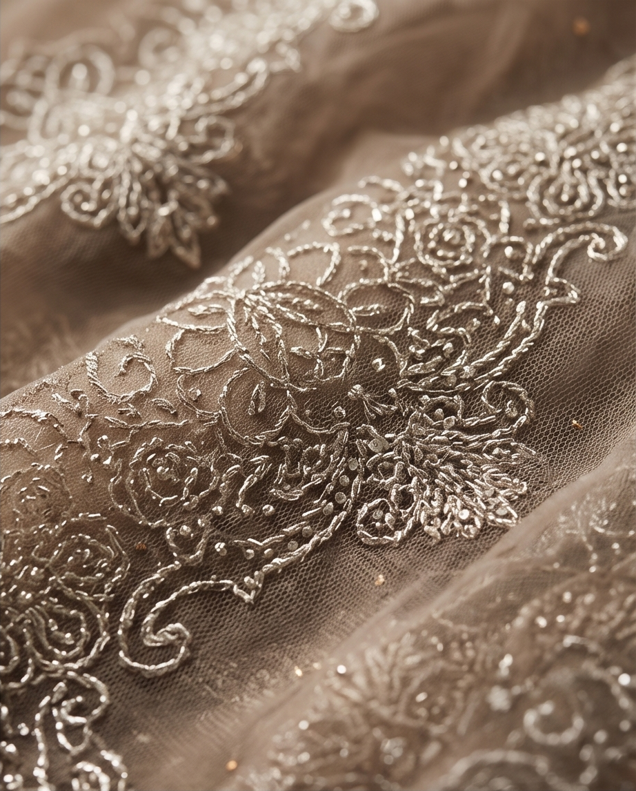 • Artistry: The work is likely a mix of zari embroidery and fine beadwork or "moti" work. The craftsmanship follows a traditional Indian aesthetic but feels modernized by the monochromatic color palette.